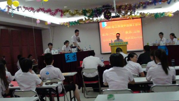 当天大赛的辩题是:在工作当中出现了错误,是先改错后认错,还是先认错后改错?事前作了充分准备的一二组代表作为正方(黄高 、 刘娟  、余伟庞)和三组代表作为反方(覃玉声 、 林静云 、梁珍妮)经过四个比赛阶段(立论陈述、攻辩、自由辩论、总结陈述)为在场每一个人带来了一场精彩的语言盛宴、文化大餐。正方立场是先改错后认错;反方立场是先认错后改错。他们都对各自的立场阐述了独特的见解。台上正反双方观点立场针锋相对, 唇枪舌战,斗智斗勇。整个赛场紧张激烈、精彩纷呈、高清跌起、有声有色,给评委和现场的观众留下了深刻难忘的印象.。经过一番恶战,反方 (覃玉声 、 林静云 、梁珍妮)更能感动观众,征服了评委团从而获得本次“文斗”的获胜奖。最后评委就辩论赛双方表现进行专业到位的评述,对本届辩论大赛起到升华主题,画龙点睛之效。并为双方选手颁奖和合影留念。